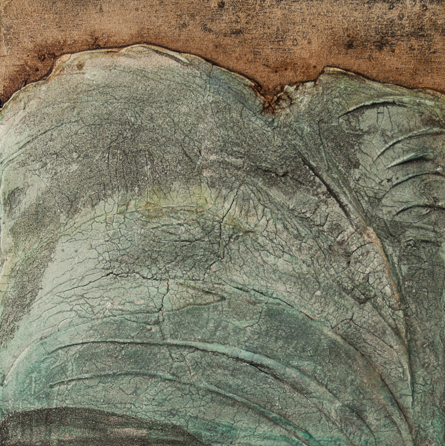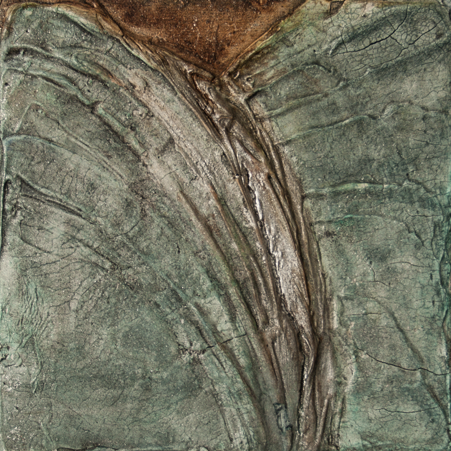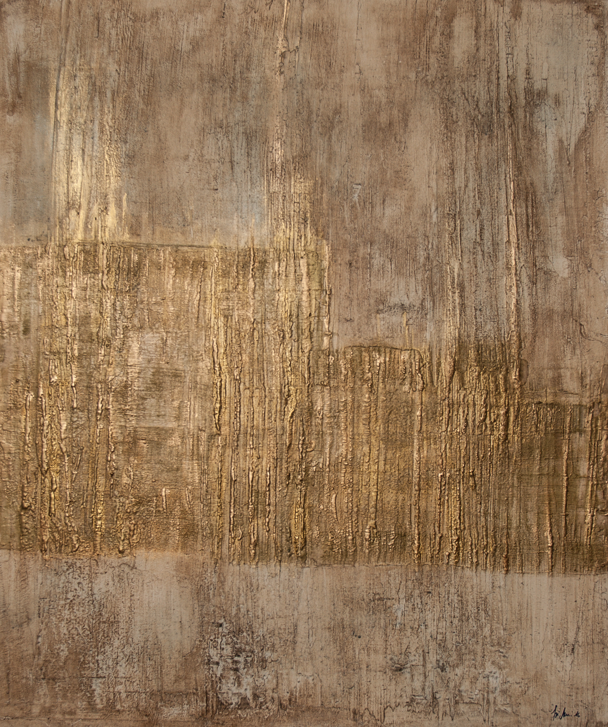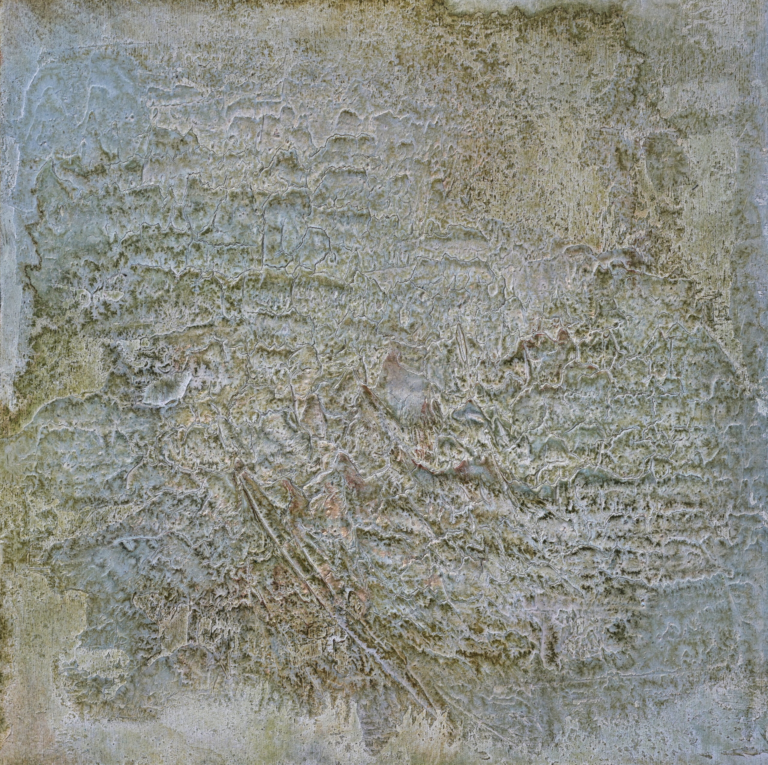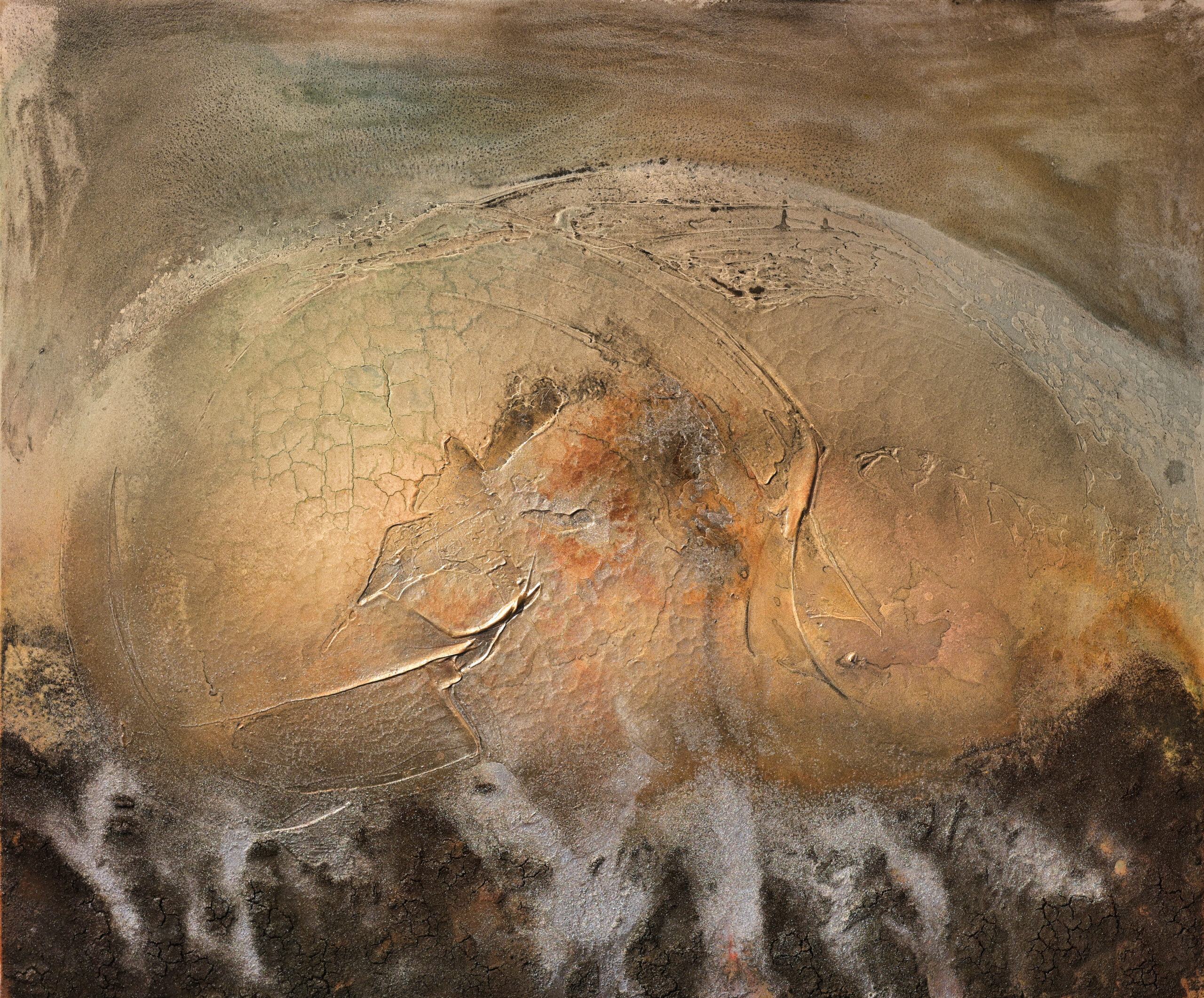 Einige Werke erhalten einen reliefartigen Charakter durch ihre Materialschichtungen und das intuitive Führen des Material auftragenden und verstreichenden Spachtels.