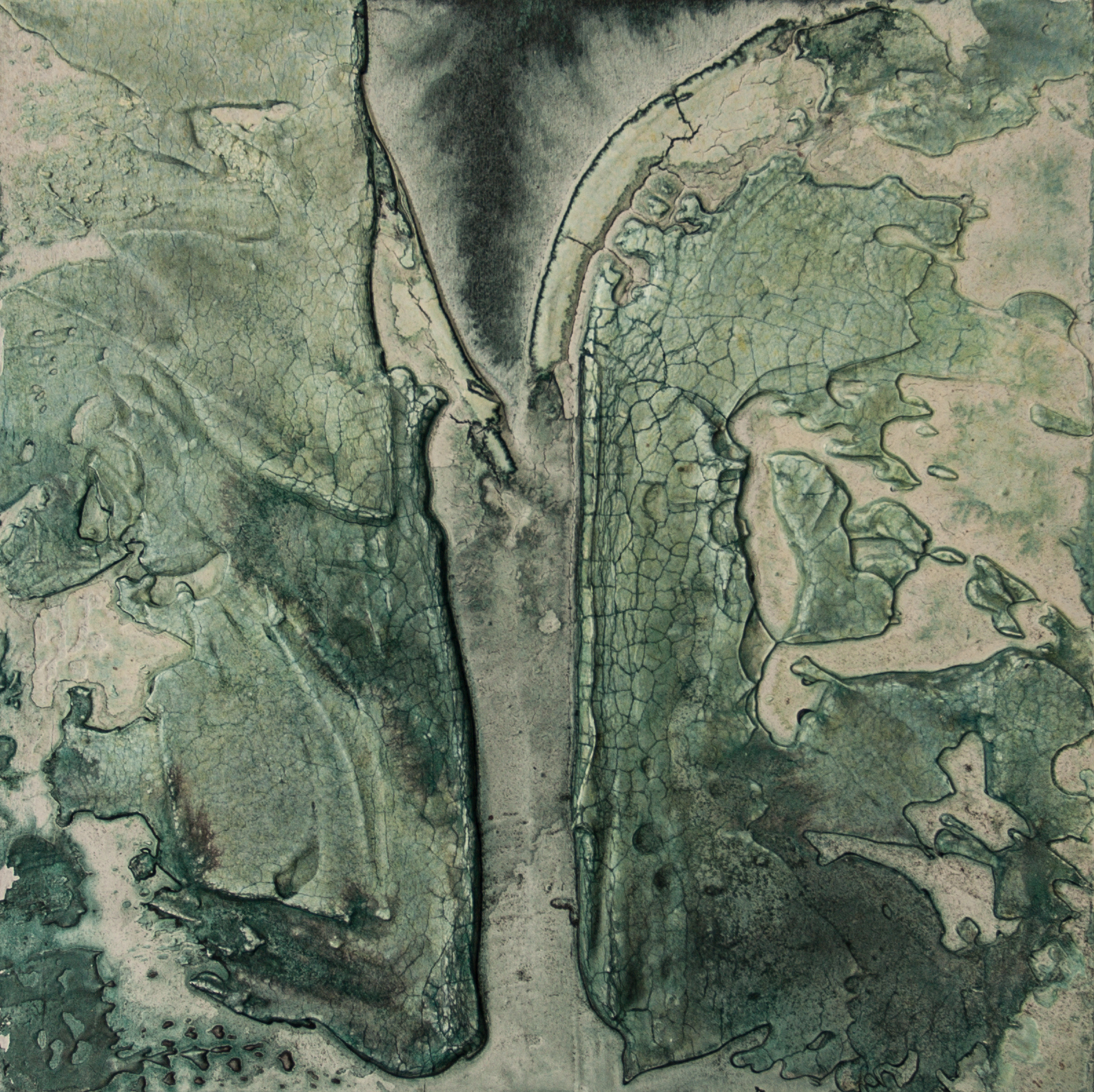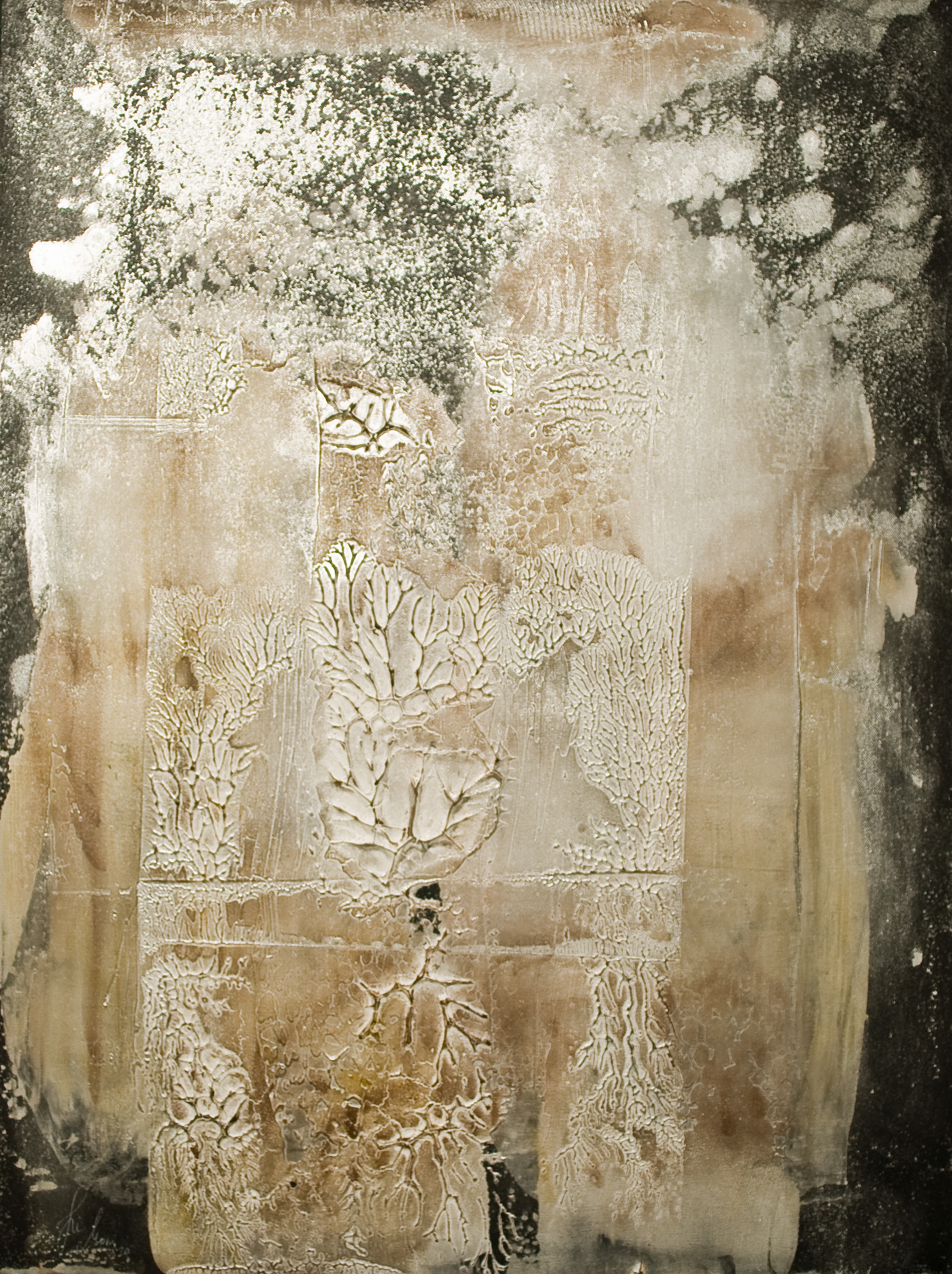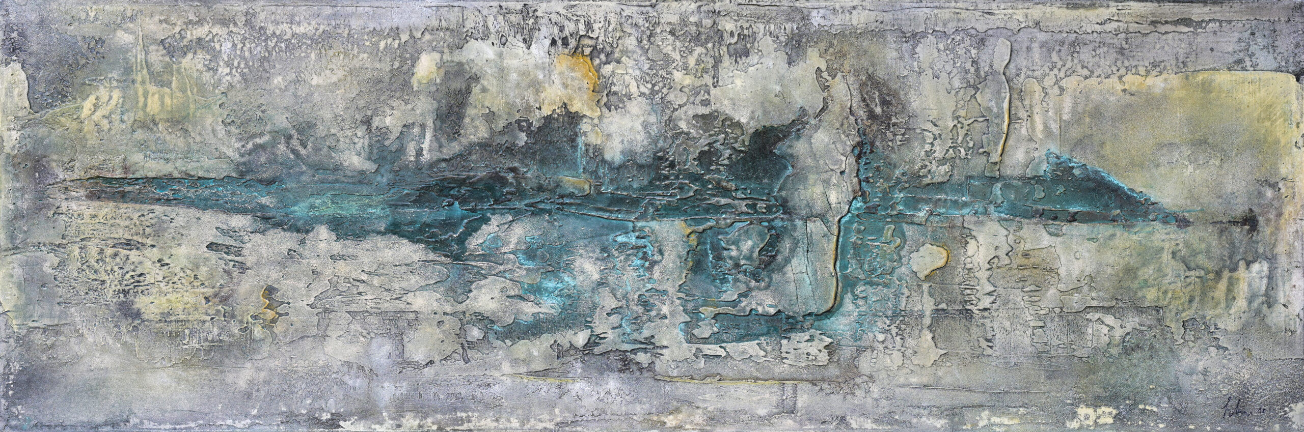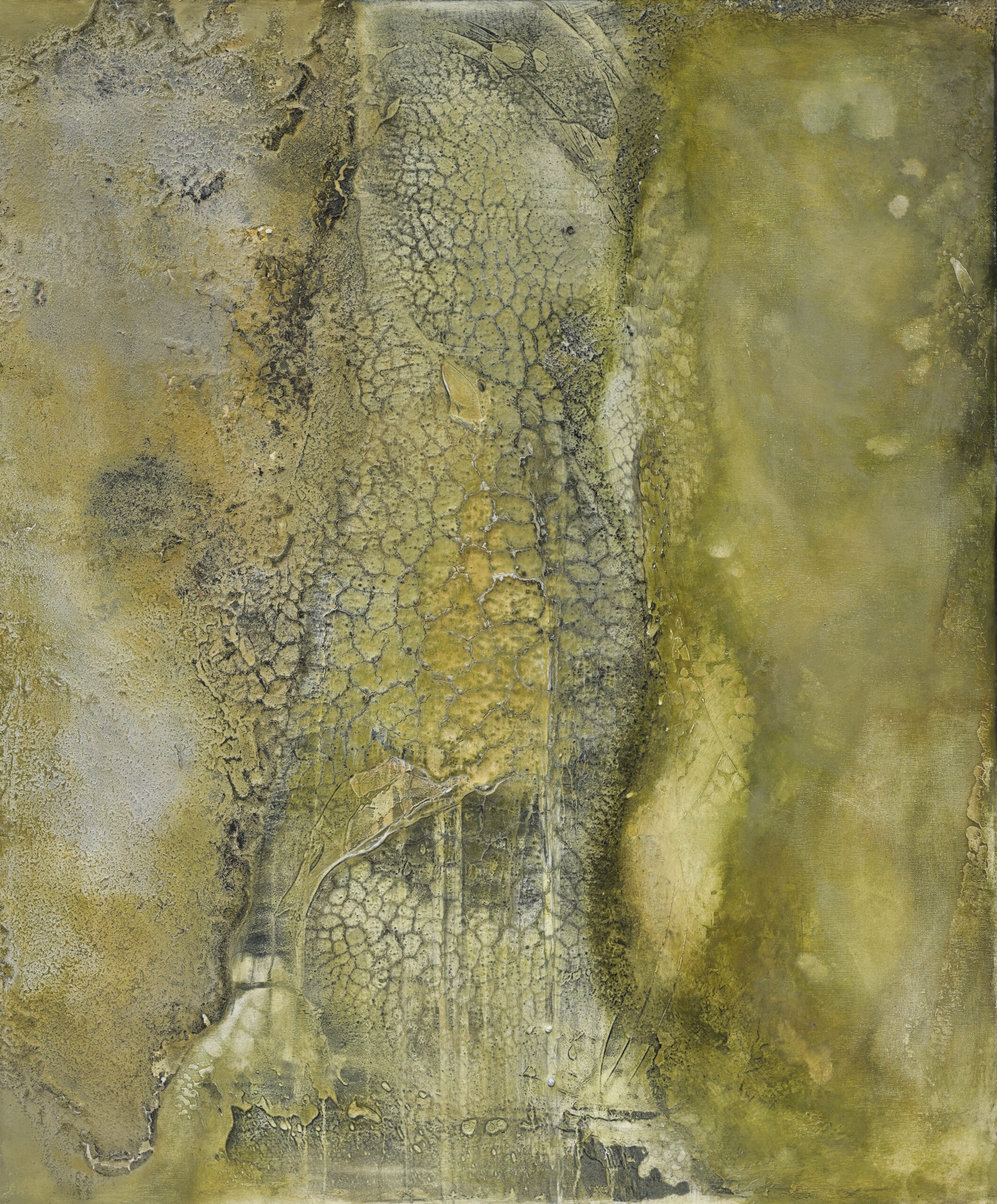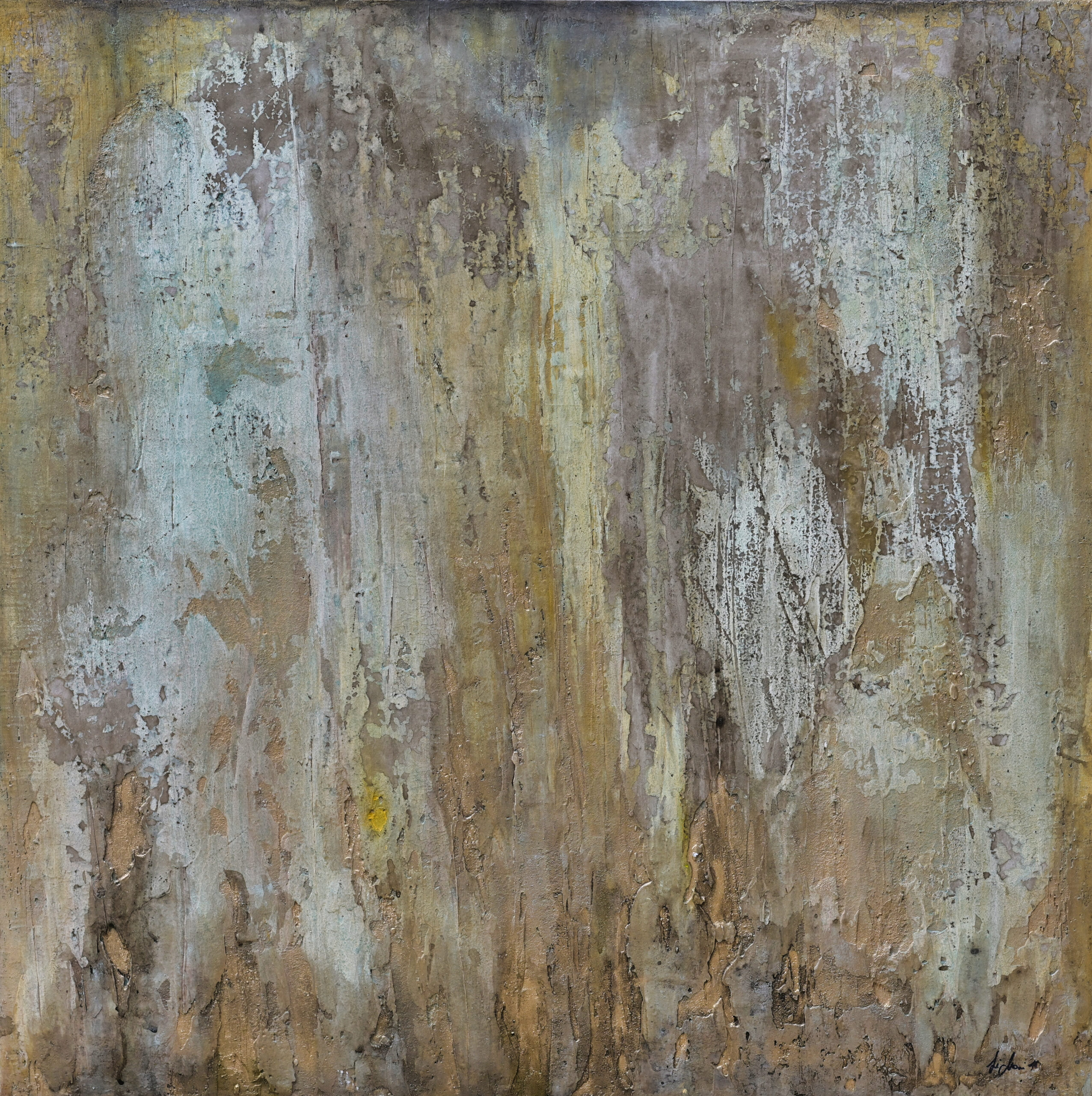 Einige Werke erhalten einen reliefartigen Charakter durch ihre Materialschichtungen und das intuitive Führen des Material auftragenden und verstreichenden Spachtels.