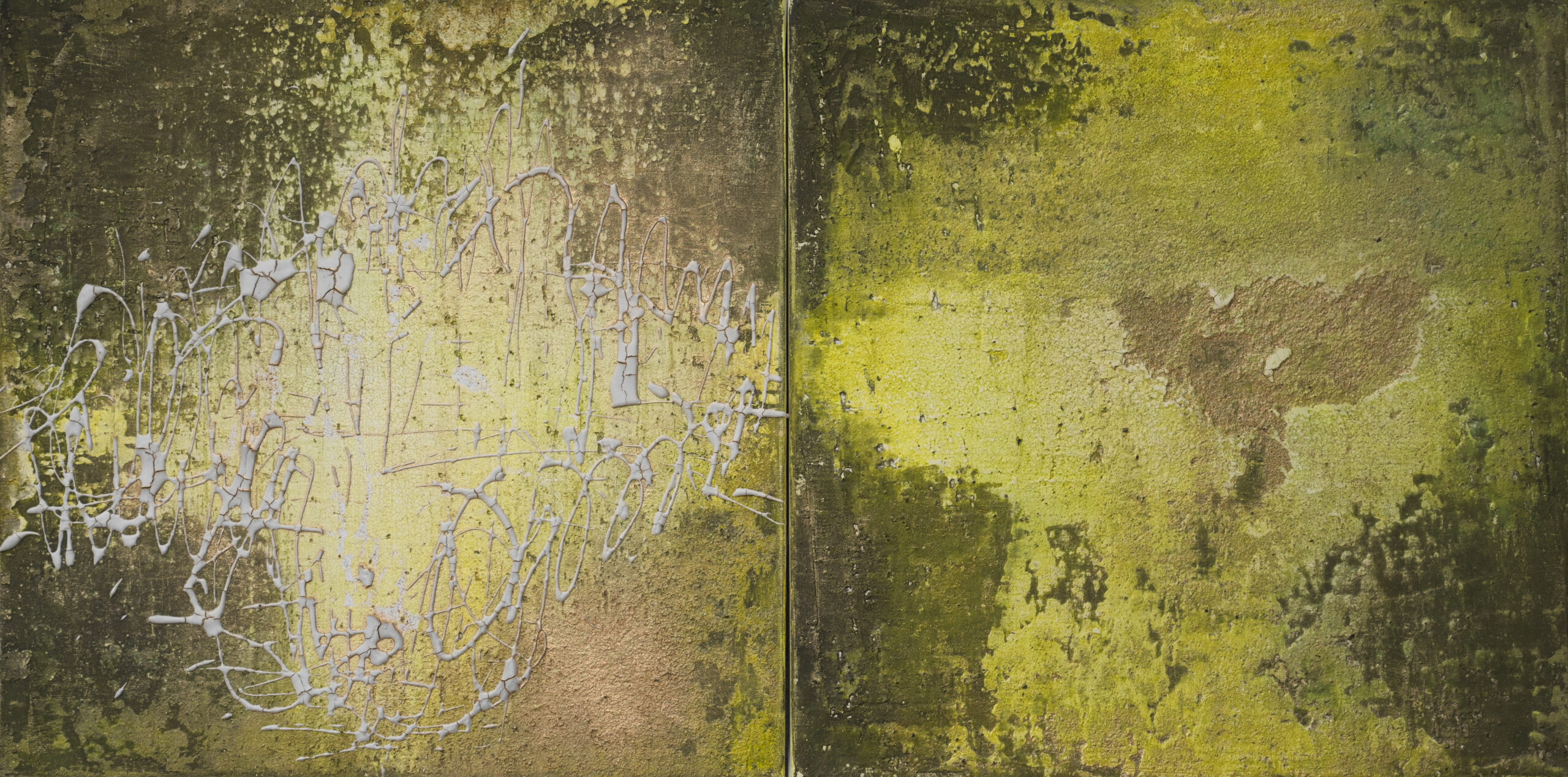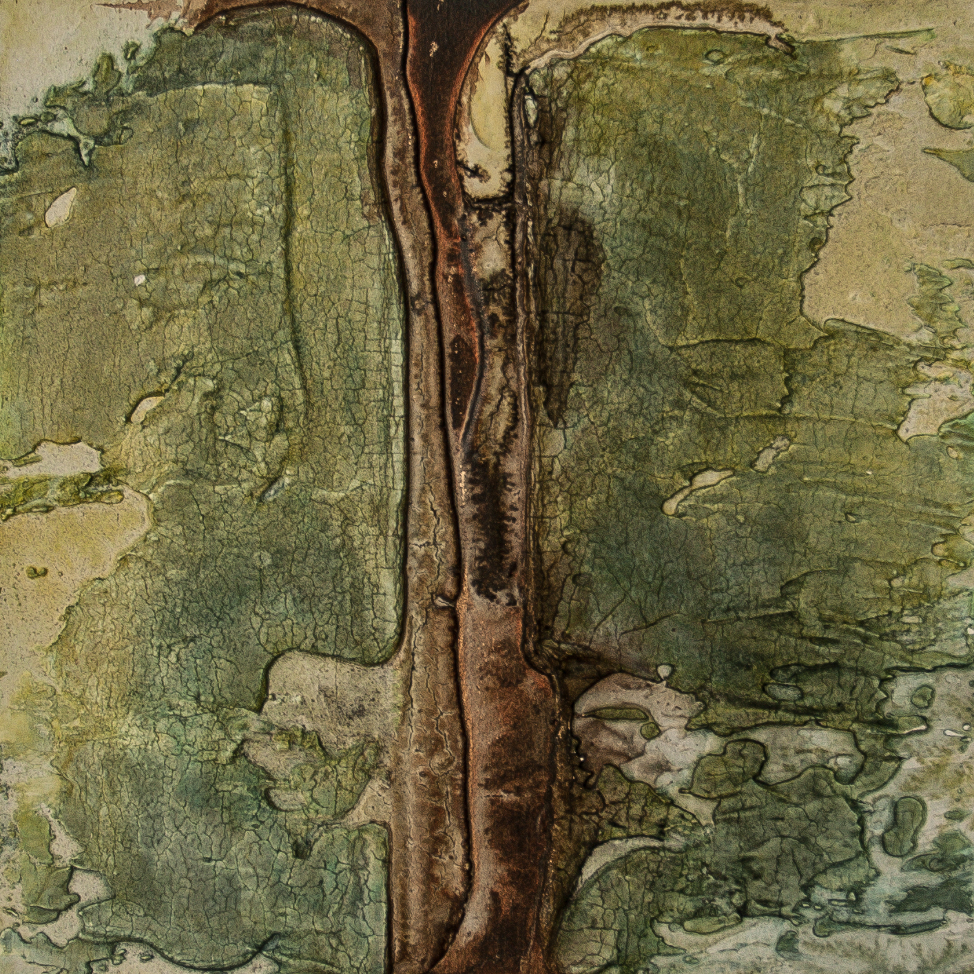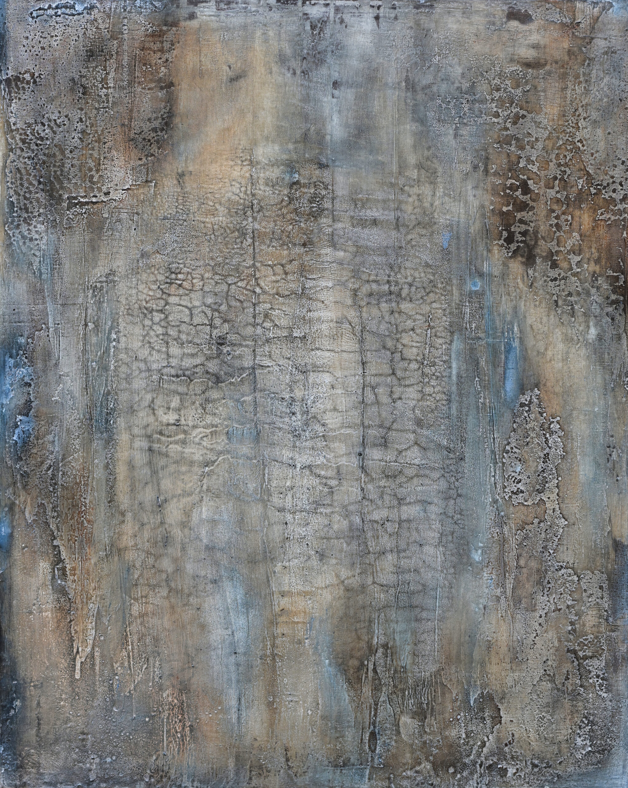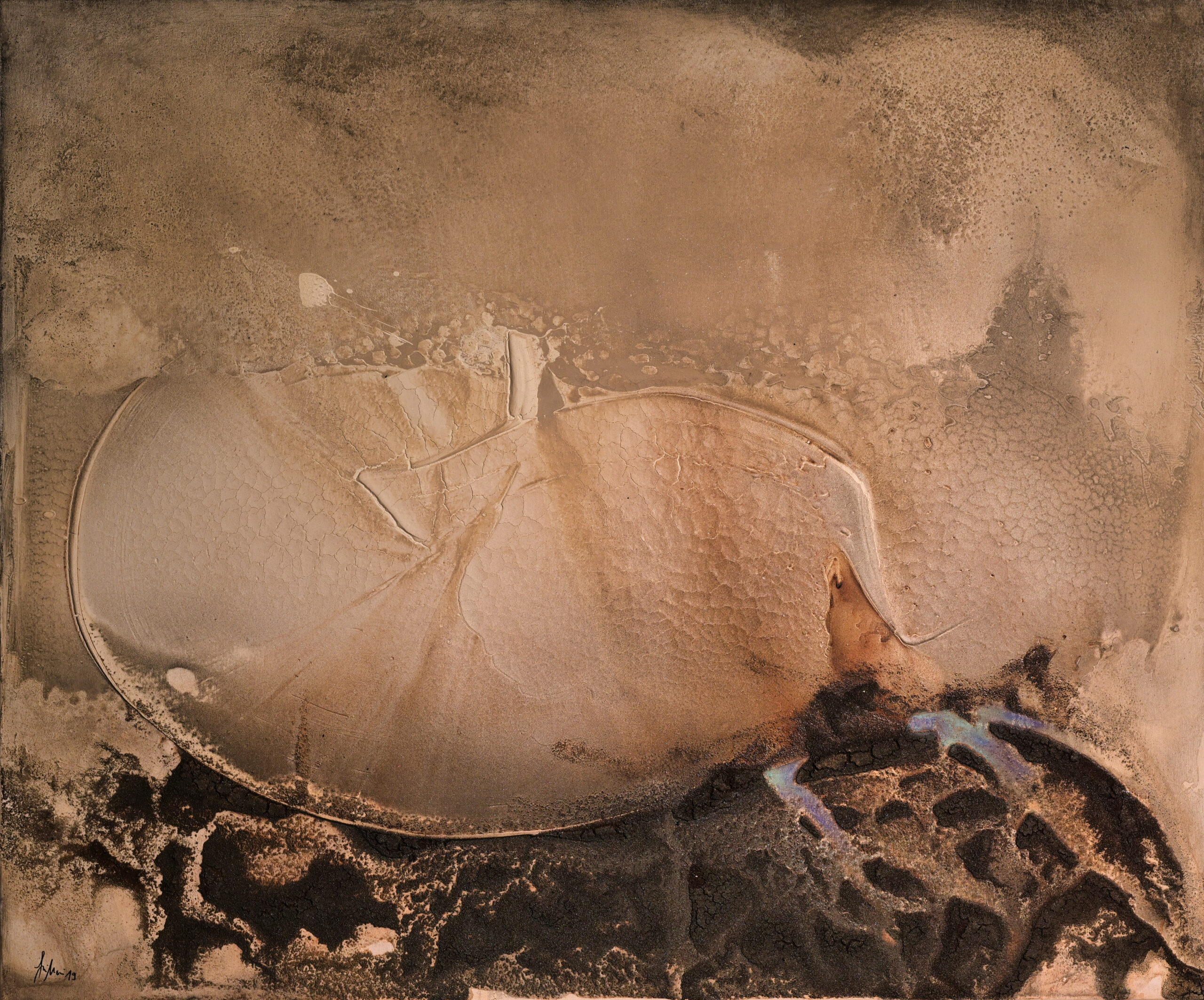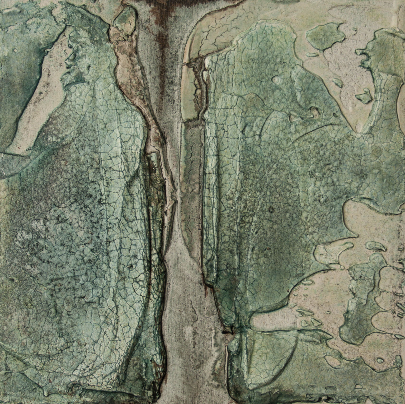 Einige Werke erhalten einen reliefartigen Charakter durch ihre Materialschichtungen und das intuitive Führen des Material auftragenden und verstreichenden Spachtels.