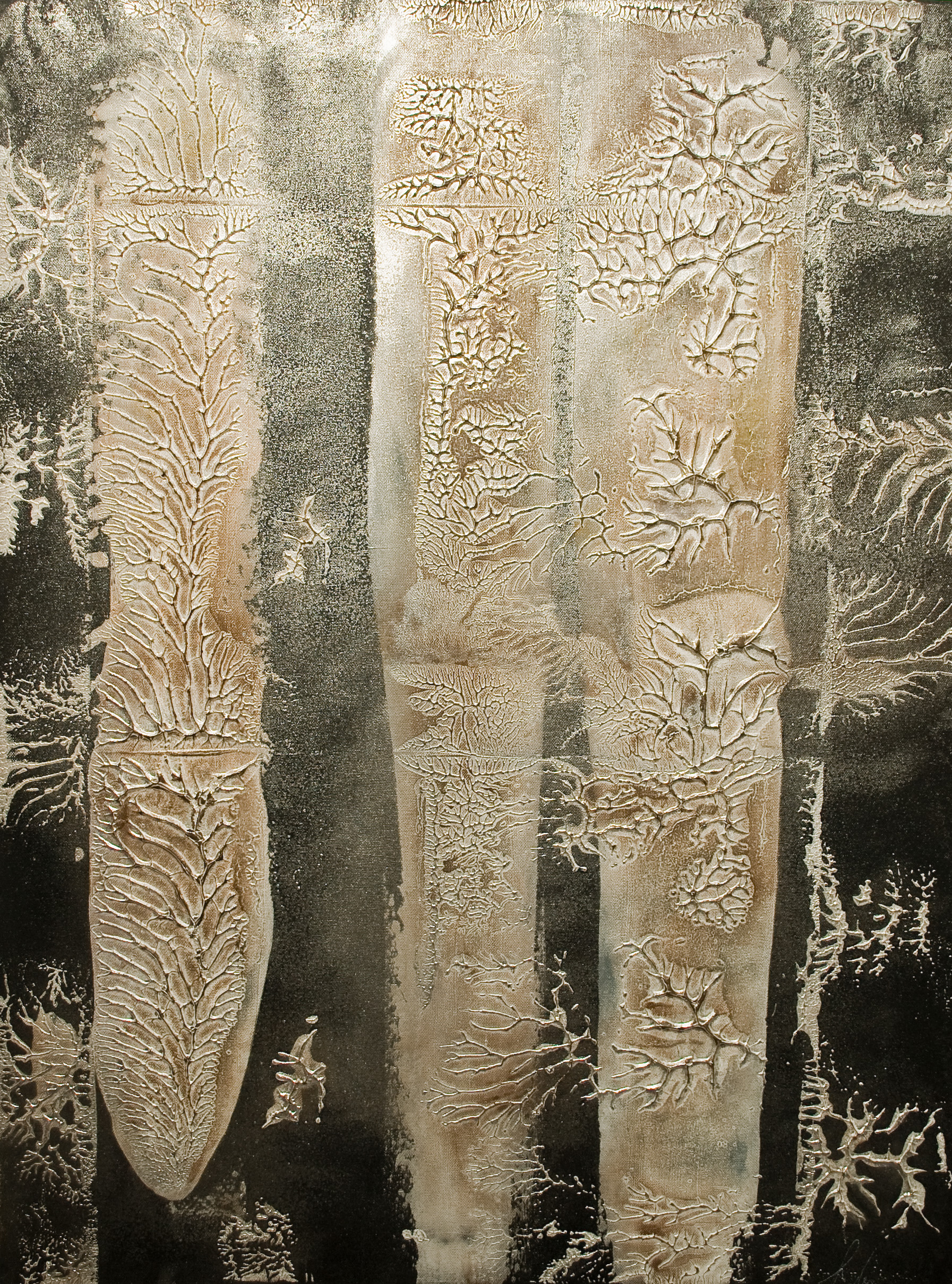 Meine Arbeiten beziehen sich auf diese Wahrnehmungen und Einsichten und haben dort ihr Fundament. Der Arbeitsprozess vollzieht sich intuitiv und bei Auftragsarbeiten für bestimmte Personen und Räume auch auf diese intuitiv bezogen.